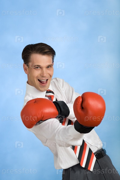Портрет счастливого бизнесмена, одетого в красные боксерские перчатки и смотрящего на камеру