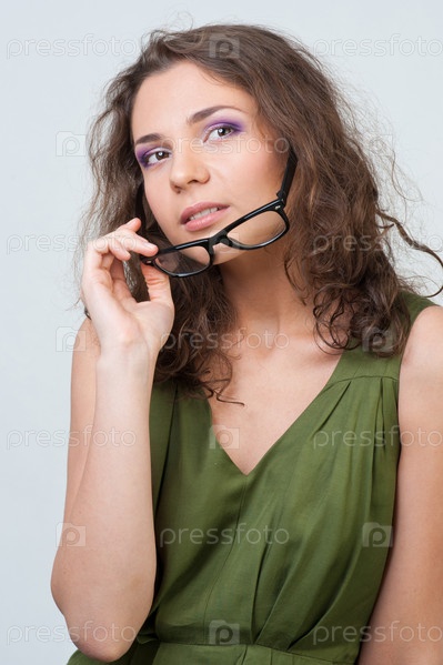 Портрет красивой молодой женщины с очками в руке