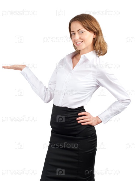 Привлекательная деловая женщина показывает что-то на ладони на белом фоне