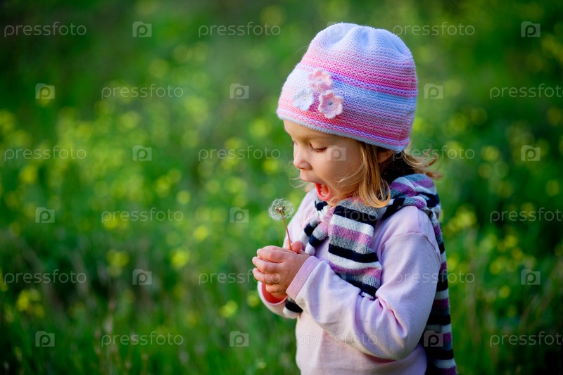 Маленькая девочка собирается подуть на одуванчик