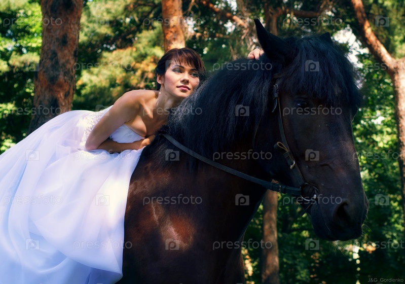 Невеста позирует на лошади в лесу