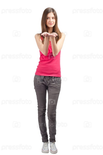 Улыбающаяся девушка в майке и джинсах что-то показывает на ладонях