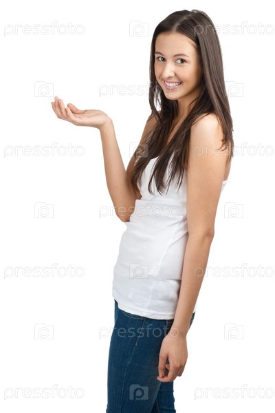 Улыбающаяся девушка в майке и джинсах что-то показывает на ладони