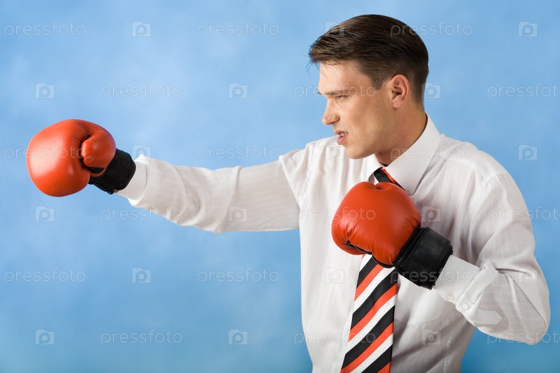 Профиль агрессивного бизнесмена в красных боксерских перчатках, протягивающего руку