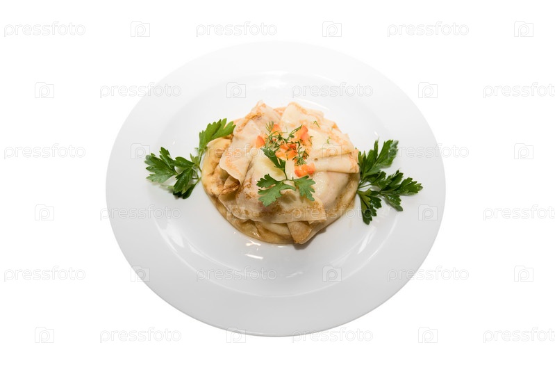 Блины с икрой в тарелке на белом фоне