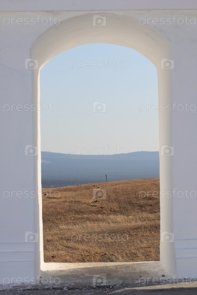 Горная местность в арке белого здания