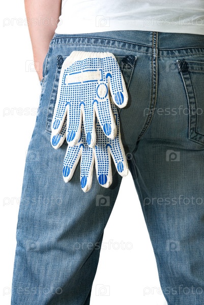 Хозяйственные перчатки свисают из заднего кармана джинс