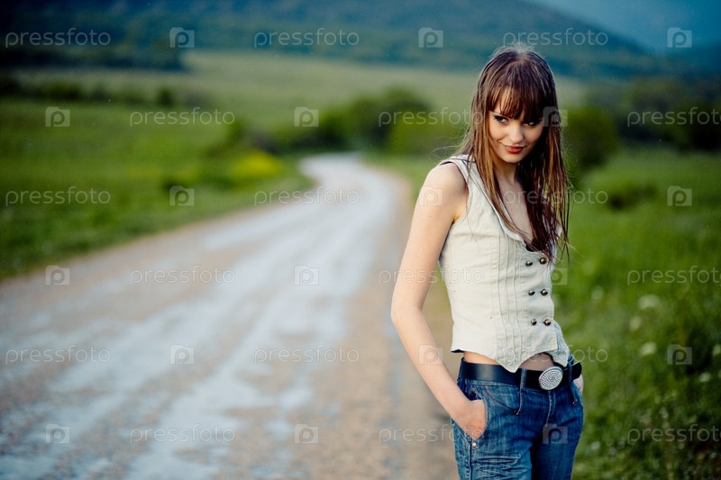 Красивая девушка в джинсах стоит на обочине дороги среди полей