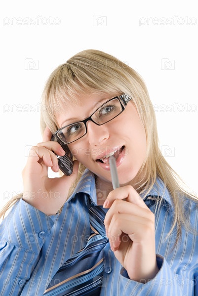 Симпатичная деловая женщина говорит по телефону, белый фон