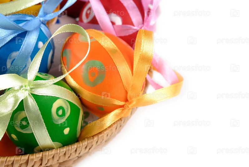 Пасхальные яйца в плетеной корзине на белом фоне