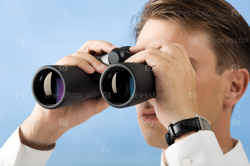 Близкий план человека, который смотрит через бинокль на светло-синем фоне