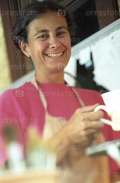 Взрослая женщина, держа чашку и улыбается