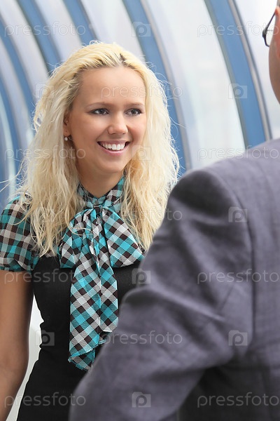 Симпатичная блондинка разговаривает с бизнесменом