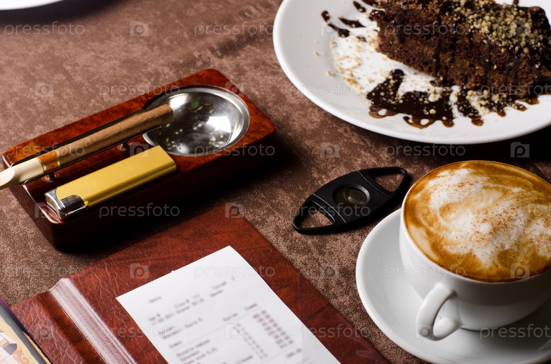 Кофе, шоколадный десерт, пепельница с сигаретой и счет на столе в кафе