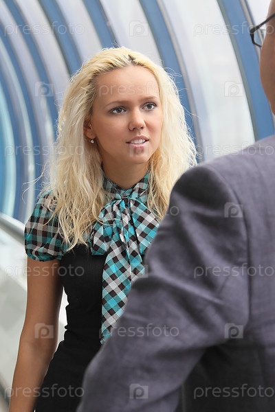 Симпатичная блондинка разговаривает с бизнесменом