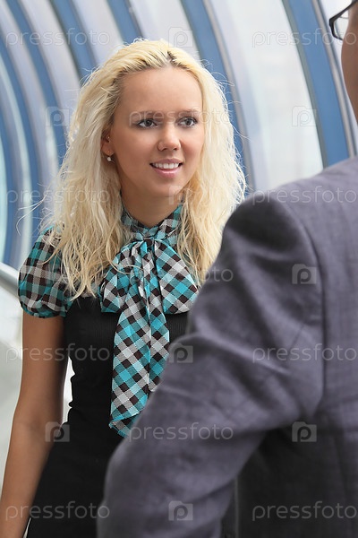 Симпатичная блондинка разговаривает с бизнесменом
