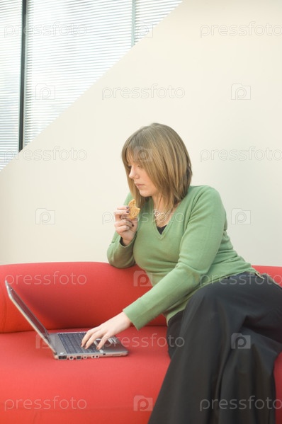 Взрослая женщина ест печенье и работает на ноутбуке