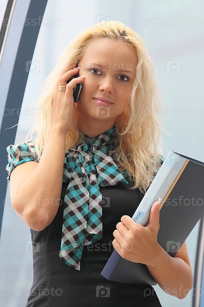 Портрет молодой симпатичной бизнес-леди с папкой и телефоном