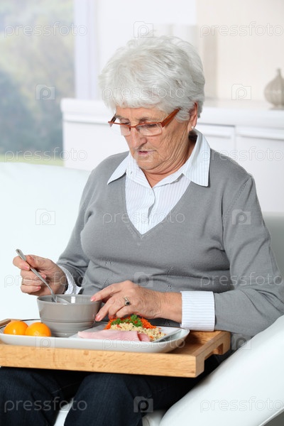 Пожилая женщина, сидя в диван с обедом лоток