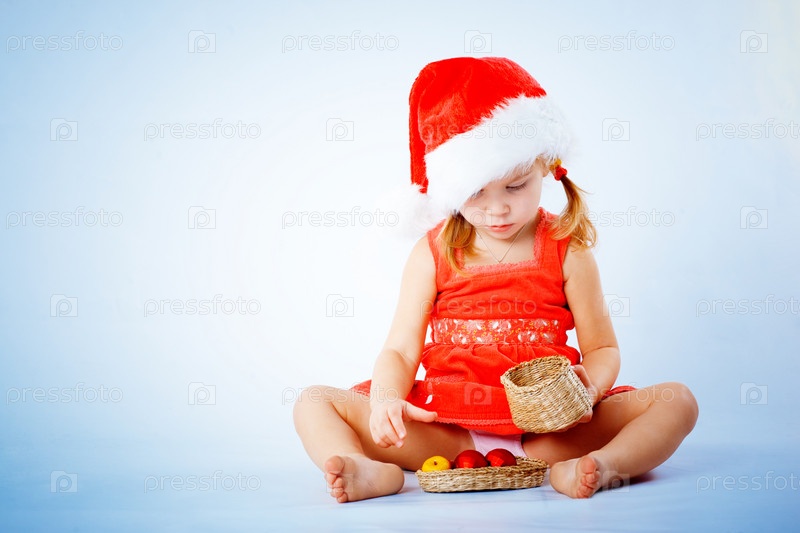 Маленькая красивая девочка в новогодней шапке играет с рождественскими украшениями