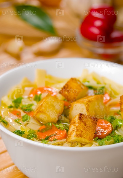 Суп с морковью, гренки и овощами