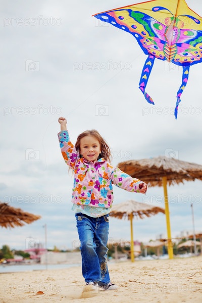 Портрет маленькой симпатичной девочки с воздушным змеем на пляже