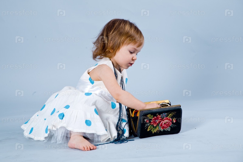 Портрет маленькой симпатичной девочки с сумочкой на голубом фоне