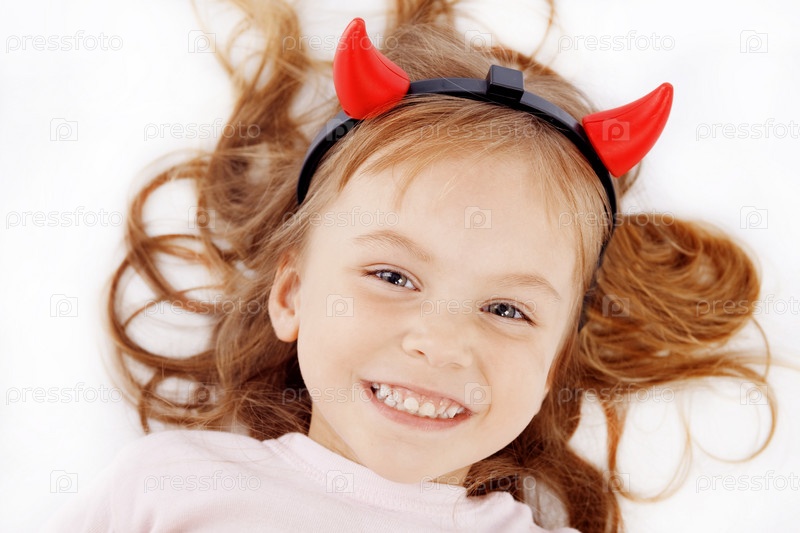 Портрет маленькой симпатичной девочки с рожками на белом фоне