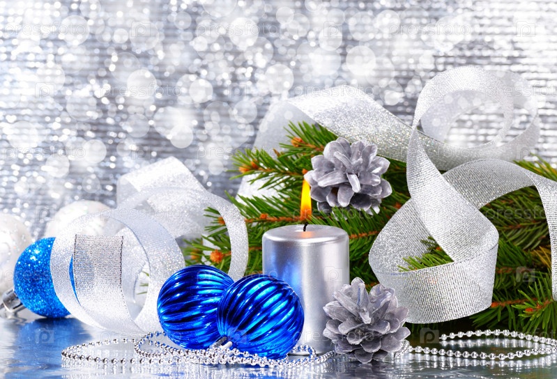 Голубые елочные шары и серебряные свечи на ярком фоне