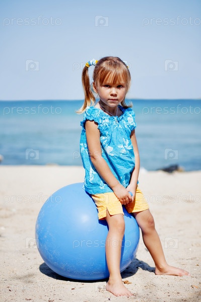 Портрет маленькой симпатичной девочки с большим голубым шаром на пляже