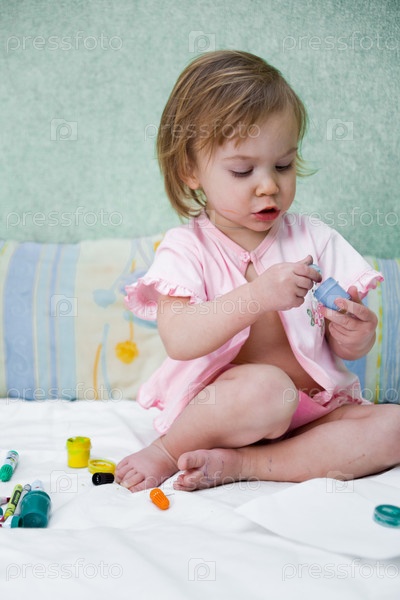 Портрет маленькой симпатичной девочки, играющей с красками на кровати