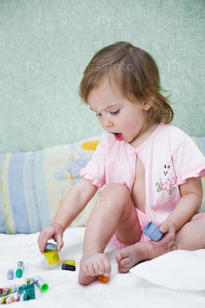 Портрет маленькой симпатичной девочки, играющей с красками на кровати