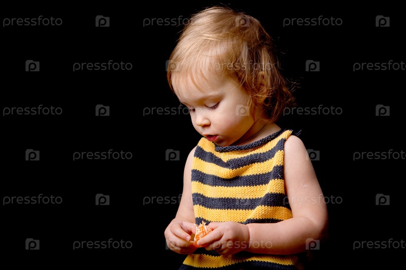 Портрет маленькой симпатичной девочки в костюме пчелы и с мандарином на черном фоне