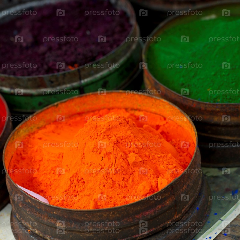 Крупным планом порошковых красок на рыночных ларька в Писак, Священной долине, регион Куско, Перу