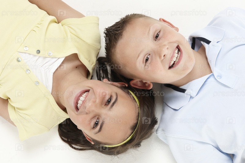 Мальчик и девочка, лежа голова к голове, глядя на камеру