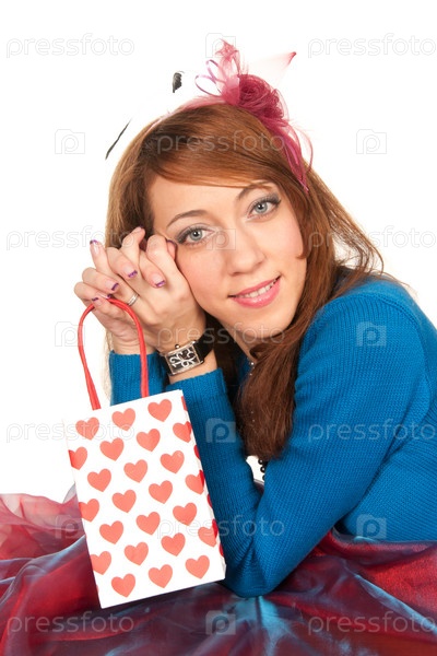 Молодая женщина с цветными пакетами на белом фоне