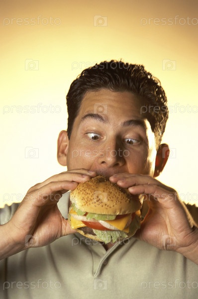 Молодой человек ест гамбургер