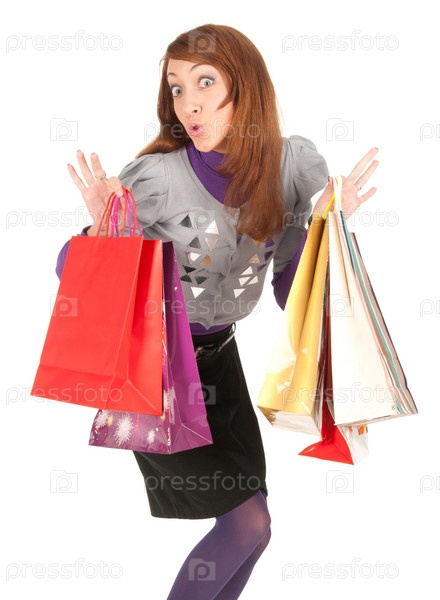 Молодая женщина с цветными пакетами на белом фоне