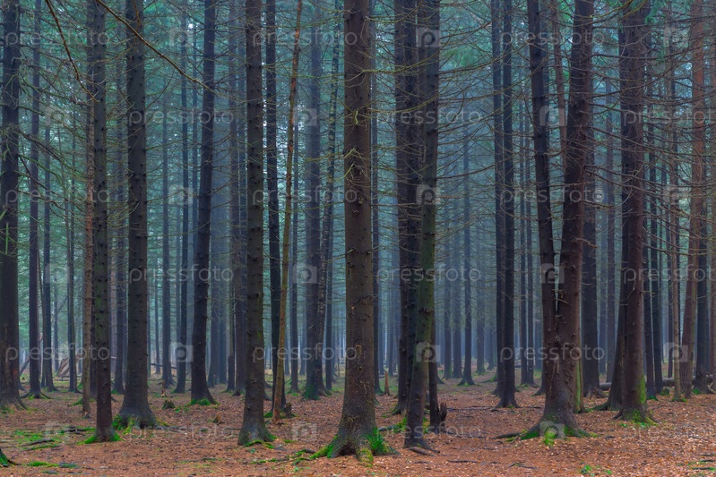 Густой темный лес хвойных осенний день