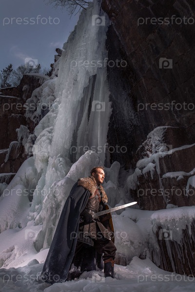 Средневековый рыцарь стоит на скалах на фоне гор