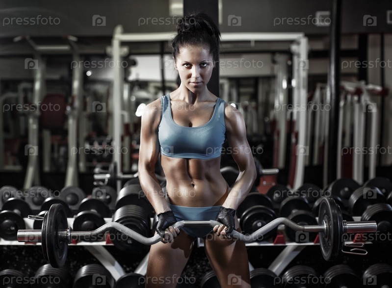 Молодая сексуальная брюнетка в тренажерном зале упражнения на бицепс со штангой