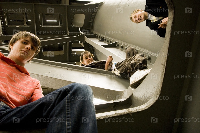 Низкий угол зрения двух подростков и подростков девушка, сидящая на мост