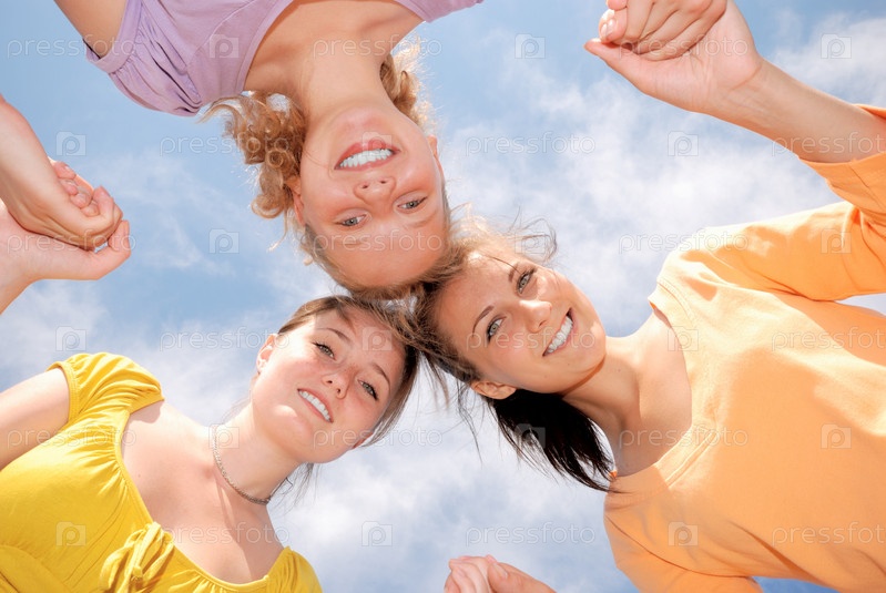 Три счастливым подростка подруг, взявшись за руки под голубым небом