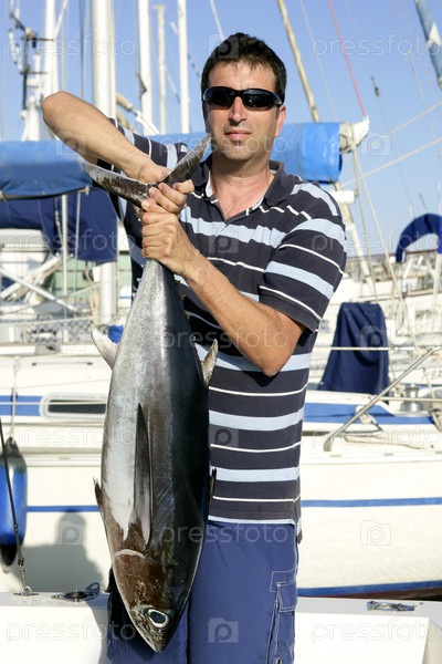 Большая игра рыбака с соленой тунца поймать в его руках