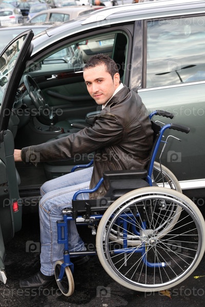 Молодой человек в инвалидной коляске, получать в своем автомобиле