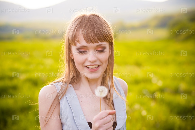 Красивая девушка с одуванчиком стоит в поле в солнечный день