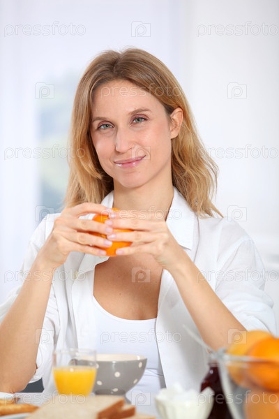Женщина, имея завтрак утром