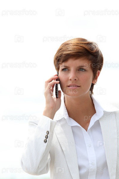 Крупным планом улыбаясь бизнесвумен, разговаривает по телефону