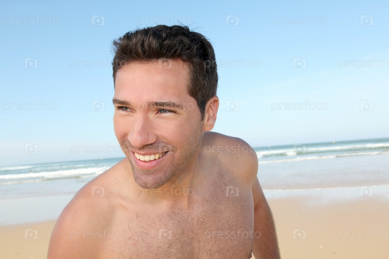 Улыбающийся человек, бег на песчаном пляже