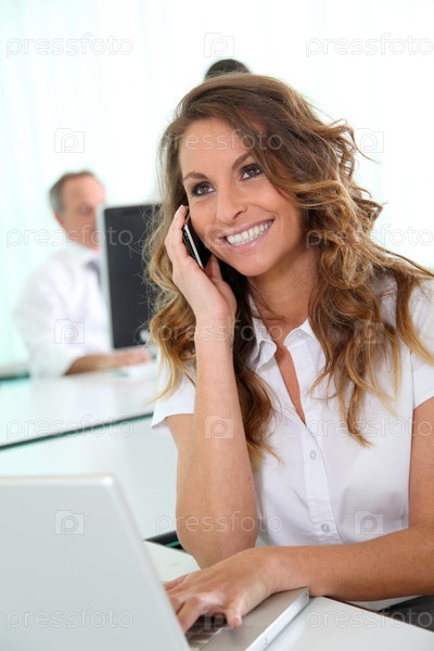 Улыбаясь бизнесвумен, разговаривает по телефону